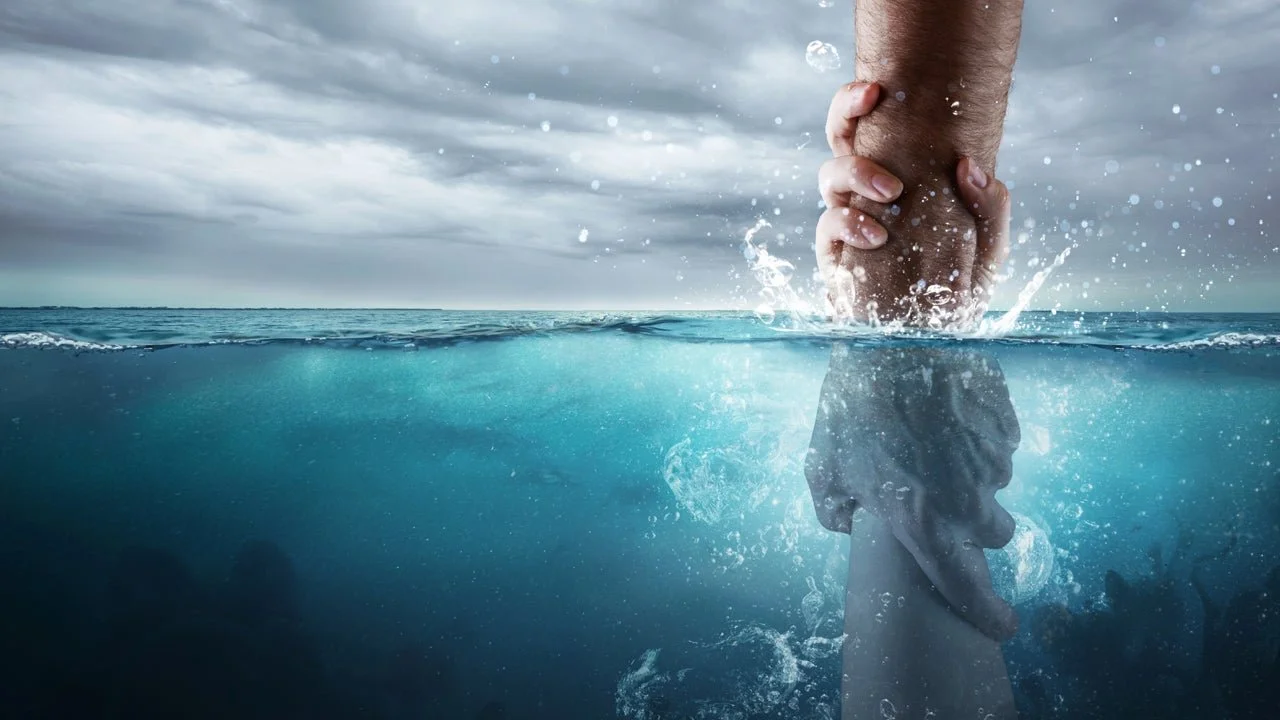He struggles, kicks, and tries everything he can to save himself—but he only grows more exhausted. Just as he’s about to go under, a rescuer reaches down, pulls him out, and brings him safely to shore.